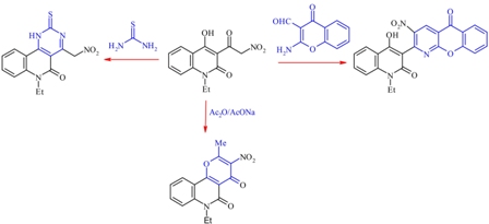 A variety of heterocyclic systems linked 1-ethylquinolin-2(1H)-one, were prepared from reaction of 3-(nitroacetyl)-1-ethyl-4-hydroxyquinolin-2(1H)-one with some electrophilic and nucleophilic reagents