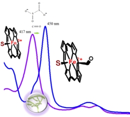 Soret bands of two states of recombinant orf10-encoded P450-camphor like protein (P450CLA) of Streptomyces clavuligerus expressed in Escherichia coli Rosetta: the resting form (light gray) and the finger print of this hemeprotein characterized by Soret band peaking at 450 nm for the ferrous-CO complex (pink). Cytochrome P450 CLA is involved in the clavulanic acid biosynthetic pathway (color structure at right side) able to inhibit β-lactamase of penicillin-resistant bacteria. See details in the Article Structure and Peroxidase Activity of Ferric Streptomyces clavuligerus orf10-encoded Protein P450CLA: UV-Visible, CD, MCD and EPR Spectroscopic Characterization by Goto et al. on page 913