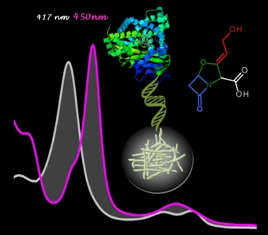 How to cite this articleSoret bands of two states of recombinant orf10-encoded P450-camphor like protein (P450CLA) of Streptomyces clavuligerus expressed in Escherichia coli Rosetta: the resting form (light gray) and the finger print of this hemeprotein characterized by Soret band peaking at 450 nm for the ferrous-CO complex (pink). Cytochrome P450 CLA is involved in the clavulanic acid biosynthetic pathway (color structure at right side) able to inhibit β-lactamase of penicillin-resistant bacteria. See details in the Article Structure and Peroxidase Activity of Ferric Streptomyces clavuligerus orf10-encoded Protein P450CLA: UV-Visible, CD, MCD and EPR Spectroscopic Characterization by Goto et al. on page 913