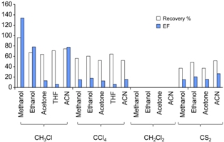 The figure shows the efficiency of dispersive liquid-liquid microextraction method for the extraction of iron ion with oxine ligand using different extraction (CH3Cl, CCl4, CH2Cl2 and CS2) and dispersive (methanol, ethanol, acetone, acetonitrile and THF) solvents