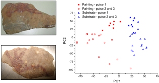 Prehistoric painting samples from Toca da Extrema II Archaeological Site (Piauí State, Brazil) and Xique-Xique Archaeological Site (Rio Grande do Norte State, Brazil). Score plot of PCA carried on the LIBS (laser-induced breakdown spectroscopy) spectra set of Toca da Extrema II Archaeological Site painting