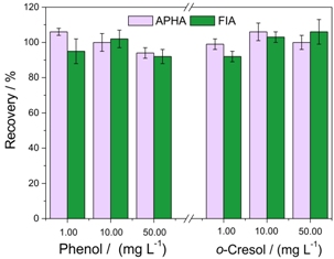 The official spectrophotometric method (APHA) for quantification of total phenol in water was adapted to flow injection analysis (FIA) for phenol and o-cresol determinations in soil extracts. As shown in the figure, a good agreement between the results was verified in a recovery study, with similar limit of quantification and sampling rate, near 50 analyses per h