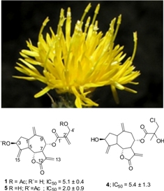 Phytochemical study of the aerial parts of Centaurea omphalotricha Coss. & Durieu ex Batt. et Trab., an Algerian endemic plant, afforded three new sesquiterpene lactones together with twelve known compounds, some of them display strong cytotoxic properties in human leukemia cells