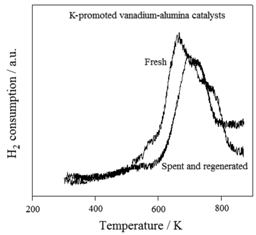 This figure shows TPR (temperature programmed reduction) profiles of fresh and regenerated K-promoted vanadium-alumina catalysts. The differences observed in these TPR patterns confirm that the deactivation of these catalysts may be related with irreversible structural changes in the vanadium oxide speciation