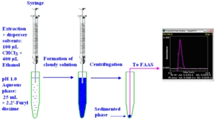 The important steps of dispersive liquid-liquid microextraction procedure for the determination of palladium(II) using 2,2'-furyldioxime. A new dispersive liquid-liquid microextraction system was developed for the determination of Pd(II) in catalytic converter, anode slime, road sediment and water samples. The compound 2,2'-furyldioxime as a complexing agent was firstly used in the determination of Pd(II) by flame atomic absorptin spectrometry using dispersive liquid-liquid microextraction procedure