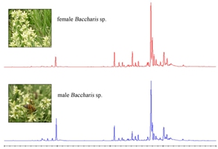 The analytical data presented in this study demonstrate that there may be a high degree of similarity between the compositions of essential oils from male and female specimens of Baccharis species