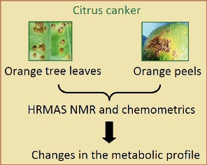 Orange tree leaves and orange peels attacked by citrus canker were analyzed by HRMAS NMR and chemometrics. Changes in metabolic profile have highlighted biochemical responses