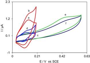 Cyclic voltammograms of a glassy carbon electrode modified with oracet blue and multi-walled carbon nanotubes (OBMWCNT-GCE) in a 0.1 mol L-1 phosphate buffer solution (pH 7.0) at scan rate 20 mV s-1 in (a) the absence and (b) the presence of 0.50 mmol L-1 hydroxylamine. (d), (e) and (f) as (b) for OBMGCE, MWCNT-GCE and activated GCE, respectively. (c) as (a) for OBMGCE