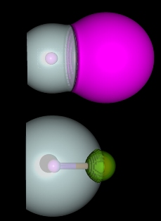 Bader volumes obtained with contour density of 0.001 a.u. at 4-component Dirac-Fock level suggest that eka-francium fluoride (top molecule, E119 in pink color) should be less ionic than lighter alkaline fluoride homologue such as KF (K in green), in contrast to the common chemical belief based on periodic trends - it would be expected the most ionic bond possible. This result should be understood as a consequence of relativistic effects