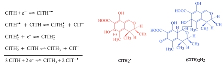 In this study, the electrochemical reduction mechanism of citrinin (CITH) mycotoxin in a non-aqueous reaction medium was investigated. (CITH)2H2 is the dimeric product obtained from the Michael-type nucleophilic addition reaction of CITH2- carbanion with another CITH molecule