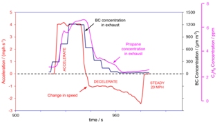 We used an Aethalometer® to measure BC concentrations with 5 s time resolution in the exhaust of a 1995 Dodge RAM 2500 diesel pick-up truck, equipped with an oxidation catalyst, using a chassis dynamometer during the acceleration, deceleration, and cruise modes of the hot start of the MEC01 test cycle (version 7.0)