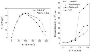 The activities of PtSnIr/C and PtSn/C E-tek electrocatalysts were evaluated in a direct ethanol fuel cell (DEFC) and similar performance was obtained using PtSnIr/C, with half content of platinum. In situ Fourier transform infrared (FTIR) analysis revealed acetic acid as main product generated from ethanol oxidation on PtSnIr/C