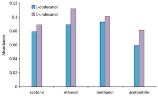 The Figure shows efficiency of DLLME-SFO technique for the extraction of the copper ion with the oxine ligand and using different extraction (1-dodecanol, 1-undecanol) and disperser (methanol, ethanol, acetone, acetonitrile) solvents