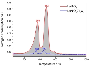 The temperature programmed reduction analysis of LaNiO3 and LaNiO3/Al2O3 showed that the Ni3+ of perovskite structure reduced in two steps and the peaks correspond to successive changes in the structure, which are related to reduction: Ni3+ to Ni2+ and Ni2+ to Ni0