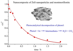 ZnS nanoparticles were deposited on montmorillonite forming a stable nanocomposite, which was used as a catalyst for the photodecomposition of phenol. Reaction kinetics agreed with the pseudo-first reaction model confirming that the high amounts of hydroxyl radicals were produced. The catalytic activity of montmorillonite was not observed