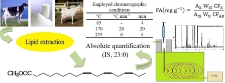 Thermal processes applied in foods can lead to a loss of their nutritional quality due to the oxidation of their polyunsaturated fatty acids. Thus, the main objective of the present study is the absolute quantification of fatty acids from cow and goat powdered milks, through the application of gas chromatography with a flame ionization detector (GC-FID)