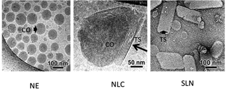 Structural characterizations of drug lipid nanocarriers made from castor oil (CO) and tristearin (TS). NE: nanoemulsions, NLC: nanostructured lipid carriers, SLN: solid nanocarriers