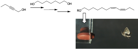The sex pheromone of the tortricid soybean pest, Crocidosema aporema, was synthesized from 2-pentynol and 1,7-heptanediol, and male captures with different pheromone blends were field-evaluated for the development of pheromone monitoring traps