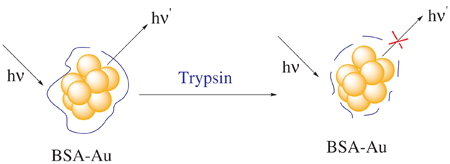 A novel fluorescence analysis method based on trypsin digestion of the protein template of BSA-stabilized Au nanoclusters for sensitive and selective detection of trypsin activity was developed in this work. The methods are utilized potentially for determination of other proteases in clinical diagnostics of various diseases