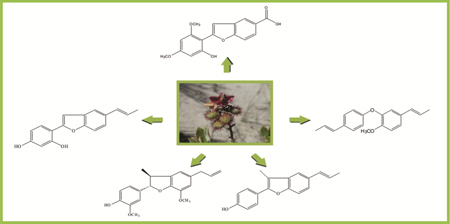 Two new neolignans 1,1'-(E)-propenyl-4-methoxy-3,4'-oxyneolignan (ottomentosa) and 5-acid-2-(2'-hydroxy-4',6'-dimethoxyphenyl)- benzofuran (sobraline), together with three known neolignans, were isolated from the roots of Krameria tomentosa A. St.-Hil