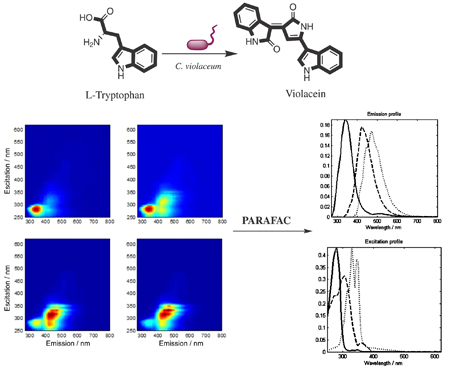How to cite this articleA culture of Chromobacterium violaceum was cultivated in a bioreactor from which aliquots were collected every two hours and analyzed by multi-wavelength fluorescence spectroscopy. The mechanistic investigation of the violacein biosynthesis was then performed by the chemometric method parallel factor analysis (PARAFAC) that was applied to resolve the fluorescence profiles. Details are discussed in the Article The Violacein Biosynthesis Monitored by Multi‑Wavelength Fluorescence Spectroscopy and by the PARAFAC Method by Clecio Dantas, Pedro L. O. Volpe, Nelson Durán and Márcia M. C. Ferreira on page 2054.