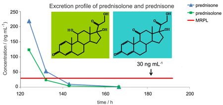 Urinary excretion profile of prednisolone and prednisone after oral administration of prednisolone. The concentration of 30 ng mL-1 is the parameter used to establish an adverse analytical finding to exogenous glucocorticosteroids