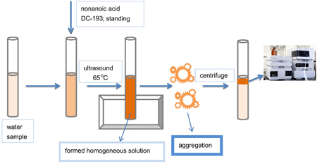 2 mL of the solution containing different concentrations of BD, HB and NPP →2.5 mL of DC-193 stock solution and 1mL of nonanoic acid added → standing for 5 min → incubated into ultrasonic-thermostatic bath at 65 °C for 30 min → centrifugation for 3 min at 4000 rpm → achieving a final volume of 0.5 mL by adding acetonitrile → injected into the HPLC system