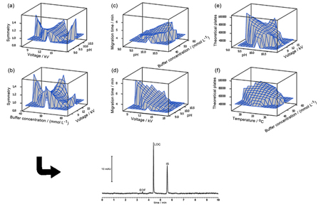 A simple capillary zone electrophoresis method for determination of lodenafil carbonate in drug products was developed and validated. Response surface methodology was used for optimization of the pH and concentration of the buffer, applied voltage and temperature