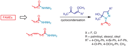 An efficient and regiospecific route to new fatty N-acyl trihalomethylated pyrazoline derivatives from FAMEs (fatty acid methyl esters) was developed