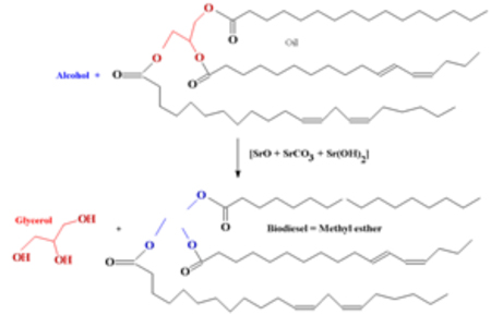 Compounds of strontium (SrO + SrCO3 + Sr(OH)2) can efficiently catalyze the transesterification reaction of babassu and castor oils as well as a mixture of these oils. This method can greatly contribute to the settling of the transesterification process since it is more industrially satisfactory.