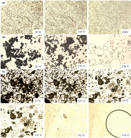 Thermo-óptical analysis (TOA) images at 100x magnification of (a) efavirenz, (b) lamivudine and (c) mixture. Three images in different temperatures were shown for each pure drug and six for the mixture.