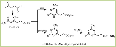 This work describes the synthesis of a novel 3-(pyrimidinyl)propanoate series from versatile precursors 7,7,7-trihalo-4-methoxy-6-oxo-4-heptenoates obtained from renewable levulinic acid. These new derivatives are promising candidates for the treatment of different nervous system diseases.