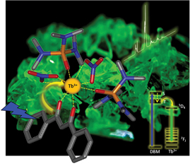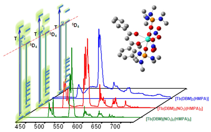 How to cite this articleA novel Tb(III)-diketonate complex, [Tb(DBM)(NO3)2(HMPA)2], that exhibits abnormally high green luminescence intensity in the crystalline form has been characterized. This complex presents considerably higher triplet state energy than its analogues [Tb(DBM)2(NO3)(HMPA)2] and [Tb(DBM)3(HMPA)] complexes, promoting a more operative antenna effect. This new complex presents potential for photonic applications based on Light Conversion Molecular Devices (LCMD). Details are presented in the Article Energy Transfer Processes in Tb(III)-Dibenzoylmethanate Complexes with Phosphine Oxide Ligands by Francisco A. Silva Jr., Helenise A. Nascimento, Dariston K. S. Pereira, Ercules E. S. Teotonio, Hermi F. Brito, Maria Cláudia F. C. Felinto, José Geraldo P. Espínola, Gilberto F. Sá and Wagner M. Faustino on page 601.