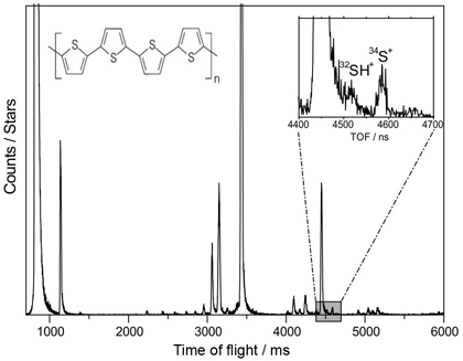 The response of poly(thiophene) to the impact of electron and photon beams at different energies was investigated. The mechanism of formation of the principal ionic species was elucidated by the ion desorption yield analysis. The effect of the thickness of the films on the desorption process was investigated by photodesorption analysis.