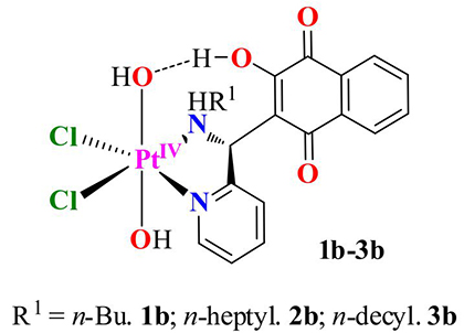 Hydrogen bond interaction between the naphthoquinone 2-hydroxyl group and an axially Pt4+-coordinated hydroxide ligand in novel 1b-3b has been proposed to favor the Pt4+/Pt2+ reduction, and thus 1b-3b show similar cytotoxicity to their Pt2+ counterparts.