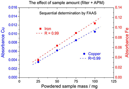 A slurry sampling flame atomic absorption spectrometric (FAAS) method is proposed for the sequential determination of copper and iron in airborne particulate matter (APM) collected on glass fiber filters.