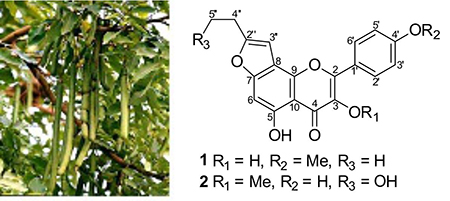 Two new 2"-ethyl-furanoflavones and six known furanoflavones were isolated from the stems of Cassia fistula. All the compounds were evaluated for their cytotoxicity against five human tumor cell lines. One of the compounds showed potent cytotoxicity against SHSY5Y and MCF7 cells with IC50 values of 2.7 and 2.6 μmol L-1, respectively.