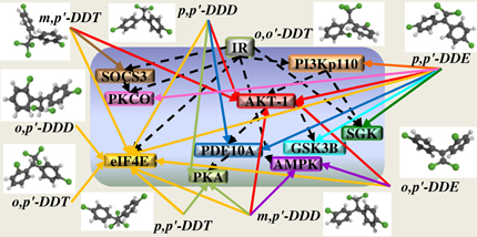 DDT (1,1,1-trichloro-2,2-bis(4-chlorophenyl)ethane) and its derivatives showed good AutoDock Vina affinity values with several proteins involved in the insulin signaling pathway, suggesting this pesticide may modulate biochemical mechanisms, eventually explaining the reported relationship between exposure to this chemical and diabetes prevalence.