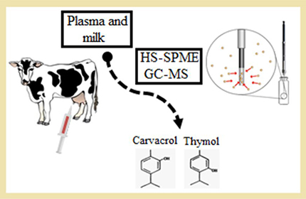 Development of an analytical method for identification and quantification of thymol and carvacrol in plasma and milk of cows after administration of an intra-mammary phytoformulation of veterinary use containing plant essential oils rich in thymol and carvacrol.