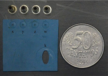 Photograph of a typical LTCC (low-temperature co-fired ceramic) device for microfluidic applications. The inlets are indicated by x, y and z, the outlet of the solutions by w and the optical flow cell by k. The cavities for coupling the brass tubes are also shown.