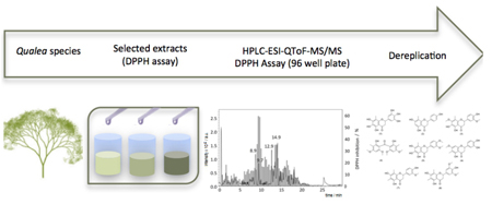 A rational and selective method using HPLC-ESI-QToF-MS/MS was developed for the dereplication of phenolic derivatives from Qualea grandiflora and Qualea cordata. The dereplicated metabolites were selected by previous in vitro DPPH assay. Seven flavanones and one benzophenone derivative were detected.