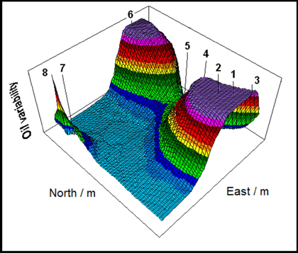 Spatial chemometric methods based on fitted models using variograms and probability maps characterized the spatial chemical structure of E. dysenterica essential oil. These methods may contribute as additional tools to establish in situ conservation areas or sampling areas for ex situ conservation based only on oil chemovariations.