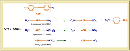 This paper presents the oxidation of three azo dyes catalyzed by ironporphyrin. The products are resulted from the oxidation of the terminal amine, while the azo bond is left intact and similar products were verified in biological systems.