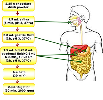 The in vitro simulation of the human digestive process occurring in the mouth, stomach and intestine with the preparation of synthetic digestive fluids containing natural enzymes was studied. This model showed to be a good strategy to assess the bioaccessibility of metallic elements in chocolate drink powder (figure adapted from http://www.aboutgastro.com/digestive-system).