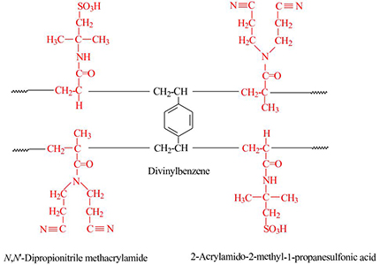 The preparation of poly(N,N'-dipropionitrile methacrylamide-co-divinylbenzene-co-2-acrylamido-2-methyl-1-propanesulfonic acid) resin was carried out with a radical initiator in dimethylformamide solution.