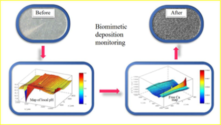 Experimental monitoring and computational simulation of titanium surface modifications during biomimetic coating. Before: Bare titanium. The pH-microelectrode can be seen at 45° towards the center. After: Coated titanium