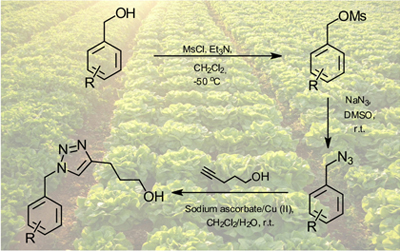 The increasing of herbicide resistant weeds has been stimulating researchers to find new chemical control agents. Within this context, heterocyclic compounds play an important role. Described in this work is the synthesis and phytotoxic evaluation of novel 1,2,3-triazole bearing halogenated benzyl moieties.