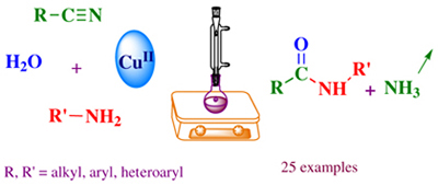 [Cu(2,3-tmtppa)](MeSO4)4 efficiently catalyzes the direct conversion of nitriles to N-substituted amides with primary amines. The one pot selective synthesis of the N-substituted amide was performed in refluxing H2O.