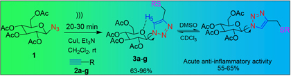 Glucopyranosyl-triazoles were synthesized in good yields under ultrasound activation. NOE experiments showed a solvent effect on the conformational equilibrium. The glucoheterocycles revealed potent anti-inflammatory activity.