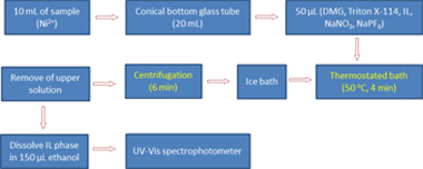This scheme shows the proposed method for the determination of nickel after preconcentration using cold-induced aggregation microextraction (CIAME).